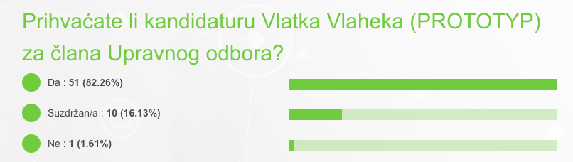 Utvrđuje se da je kandidatura Vlatka Vlaheka, PROTOTYP, prihvaćena s 51 glasova Da, 10 sudržanih i 1 glas Ne.